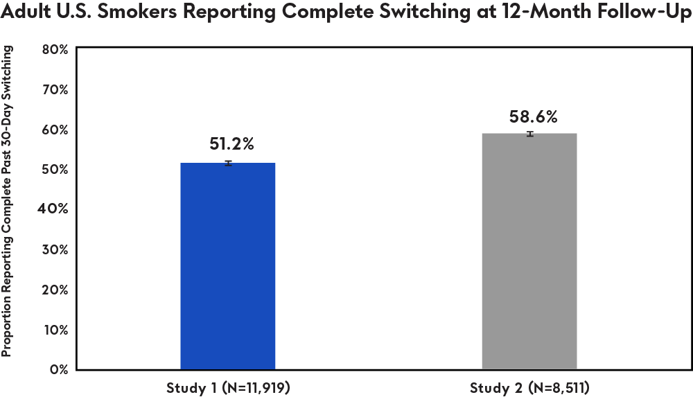 The proportion of respondents that reported complete switching at 12 months was 51.2% in one study, consisting of 11,919 adult participants, and 58.6% for the second study, consisting of 8,511 adult participants. Participants were all adult smokers who, at the start of the study, reported smoking in the past 30 days, smoking 100 or more cigarettes in their lifetime, and smoked “some days” or “every day”. Participants were recruited into the studies after purchasing a JUUL System Starter Kit in 2018, and completed recurring online surveys over the course of 12 months.